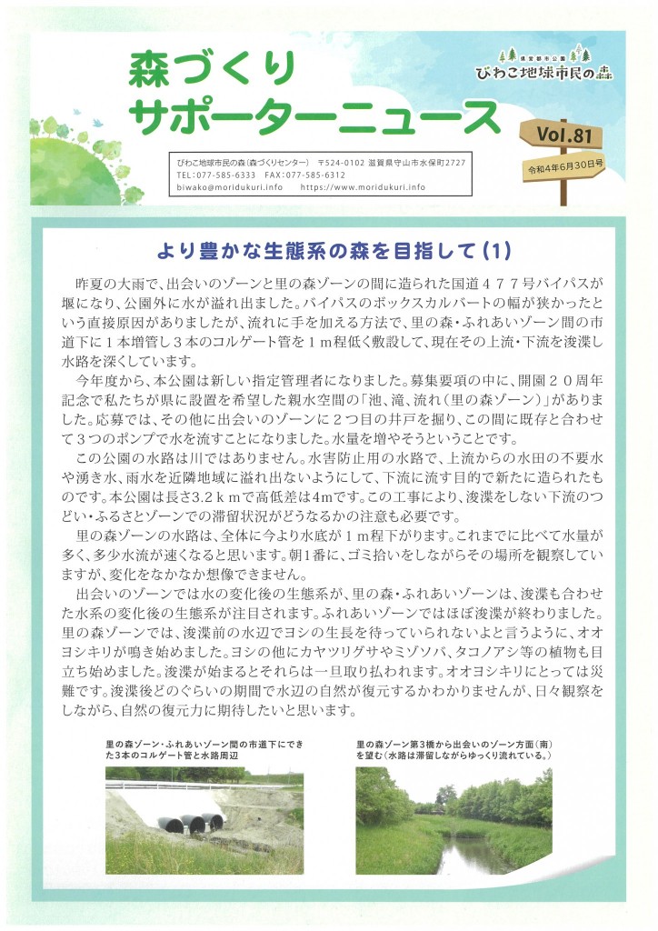 なお、サポーターニュースは、右欄の「びわこ地球市民の森 森づくりサポーターニュース」の項目でも過去のものを含めて閲覧できます。