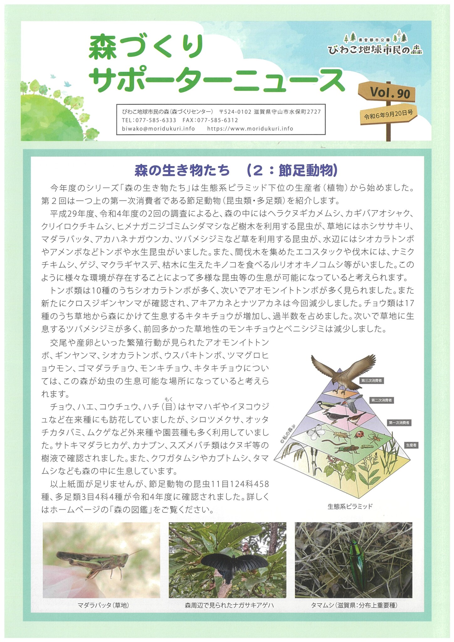 2024.9.15 森づくりサポーターニュースVol.90(令和6年9月20日号)発行 森づくりセンターでは、びわこ地球市民の森における森づくりサポーター活動の活動報告や様々な情報発信として、年4回森づくりサポーターニュースを発行しています。 今回は、Vol.90(令和6年9月20日号)を発行しましたのでご覧下さい。 また、森づくりセンター展示コーナーにも設置していますのでご利用ください。