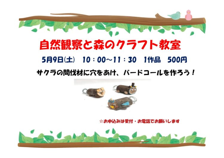 2026.4.17 自然観察と森のクラフト教室のご案内! 初めに森の中を散策してから、サクラの木に穴をあけてネジをさしこんでバードコールを作ります。お絵描きしたり、木のパーツをつけてオリジナル作品を作りませんか !?ご予約お待ちしております。 🌳TEL 077-585-6333 🌳受付時間 8時半~17時 🌳月曜休館日