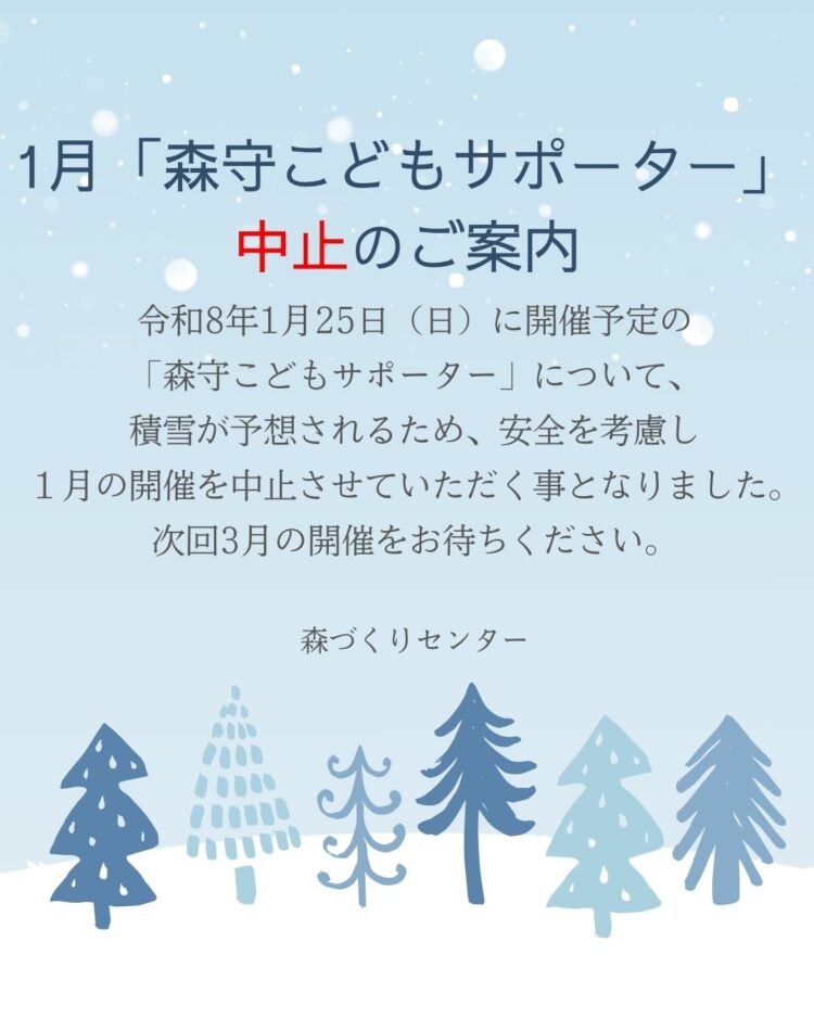 2026.1.24 1月「森守こどもサポーター」活動中止のお知らせ 令和8年1月25日(日)に開催予定の 「森守こどもサポーター」について、 当日に積雪が予想されるため、安全を考慮し、1月の開催を中止させていただく事となりました。 次回3月の開催をお待ちくださいませ。