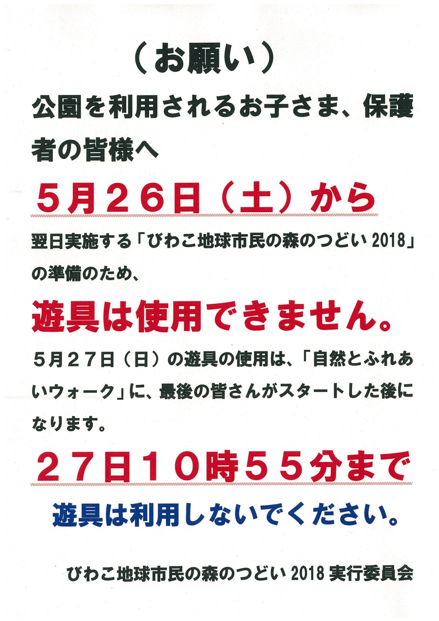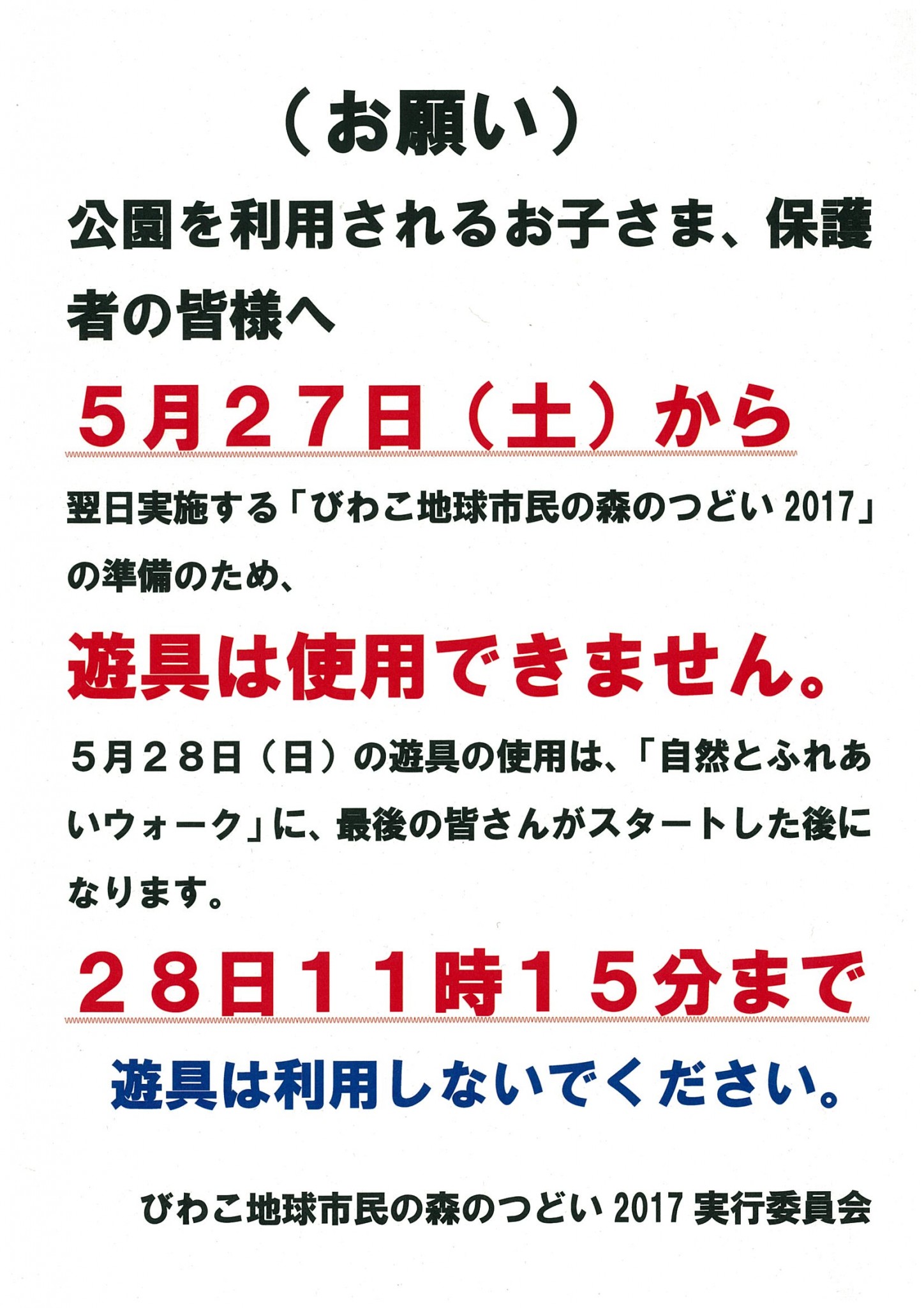 5月26日(土)から27日(日)の遊具利用について