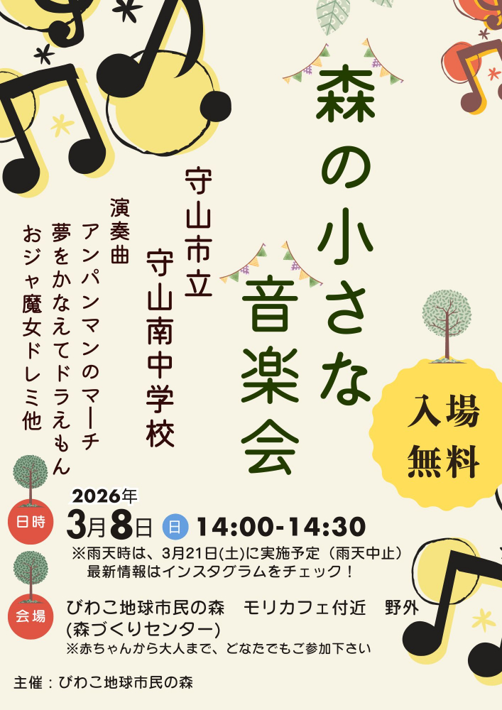 びわこ地球市民の森では、守山南中学校吹奏楽部と連携した演奏会「森の小さな音楽会」を実施します。
