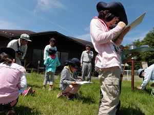 ルーペを使って植物や昆虫など草原の小さな生きものを見つけて熱心に観察しました。