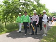 サポーター旗を掲げ開会式 サポーター旗を先頭にスタート 森の解説を聞きながらウォーク